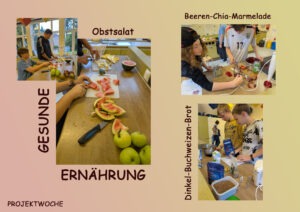 In unserer Projektwoche am Anfang des neuen Schuljahres geht es nicht nur um die vielfältige BEWEGUNG, sondern auch um die GESUNDE ERNÄHRUNG, die genauso wichtig ist für ein ausgewogenes Leben. In einer Gruppe der Jahrgänge 7 und 8 wurden Brote gebacken, Marmeladen gekocht sowie frisches Obst und Gemüse verarbeitet. Vielleicht war es für den einen Schüler oder die andere Schülerin neu, dass alltägliche Nahrungsprodukte auch ohne großen Aufwand selbst hergestellt werden können. Auf jeden Fall hat alles prima geklappt und wohl gemundet…