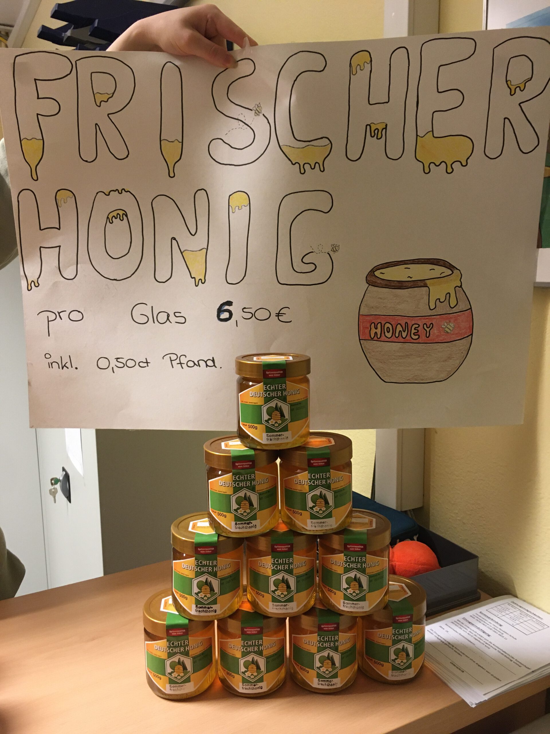 Wer gerne Honig isst und auch sonst ein eher süßer Typ ist, darf gerne einmal im Sekretariat vorbeischauen. Denn dort gibt es noch ein paar schöne abgefüllte Gläser, die nur darauf warten, gekauft und verkostet zu werden…