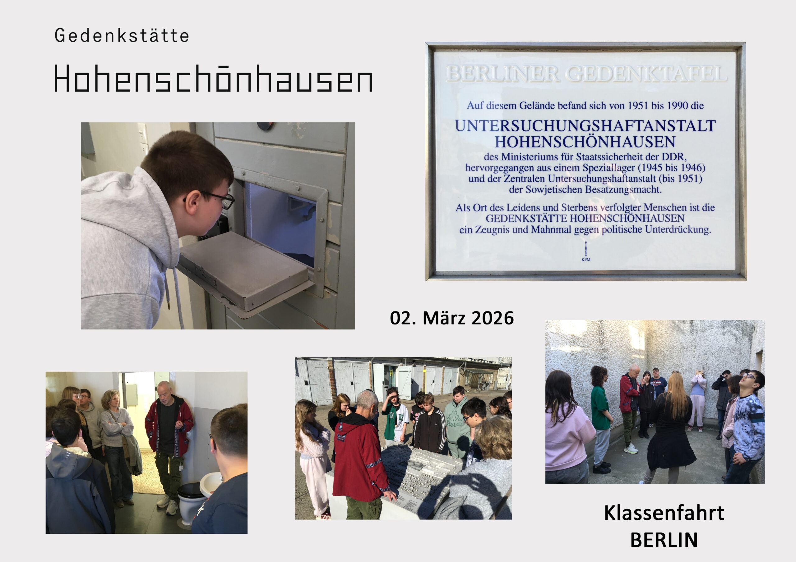 Heute waren wir am Vormittag in der Gedenkstätte Hohenschönhausen. In diesem DDR-Untersuchungsgefängnis der Staatssicherheit (Stasi) wurden vielen Menschen ihre Würde genommen, indem sie unrechtmäßig verhört sowie physisch und psychisch gequält worden sind. In sehr eindrucksvoller Weise sind wir durch diesen damals undemokratischen Ort geführt worden und konnten sehr anschaulich erkennen und nachvollziehen, was es bedeutet, in einer Diktatur und somit nicht in Freiheit zu leben…